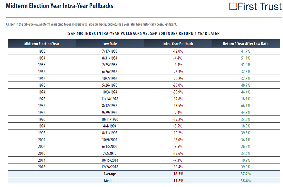 This chart shows that year-to-date has been a challenge in the market with reaching bear market levels during the third quarter. Bear market demonstrates a 20% drop from the highest points (which, in this case, occurred in January). The S&P500 recorded a drawdown of 27% at its low point in 2022. The research team at First Trust compiled the following list of midterm election year pullbacks in the S&P500. Each midterm year had some level of pullback during the year. Notably, each year after showed positive returns.