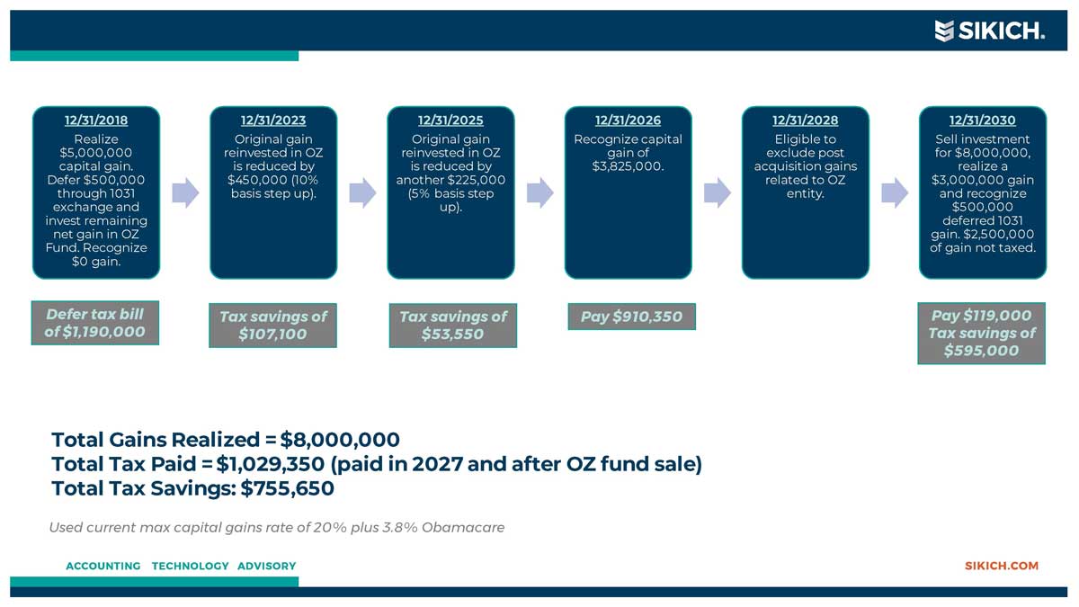 - Step-up in basis for investments held in OZ funds: If the investment in the OZ fund is held by the taxpayer for at least five years, the basis on the original gain is increased by 10 percent of the original gain. If the OZ asset or investment is held by the taxpayer for at least seven years, the basis on the original gain is increased by an additional five percent of the original gain. The reinvestment needed to be made by December 31, 2019 to achieve the maximize 15 percent step-up; however, post-2019 investments will still qualify for the 10 percent step-up if held for five years.